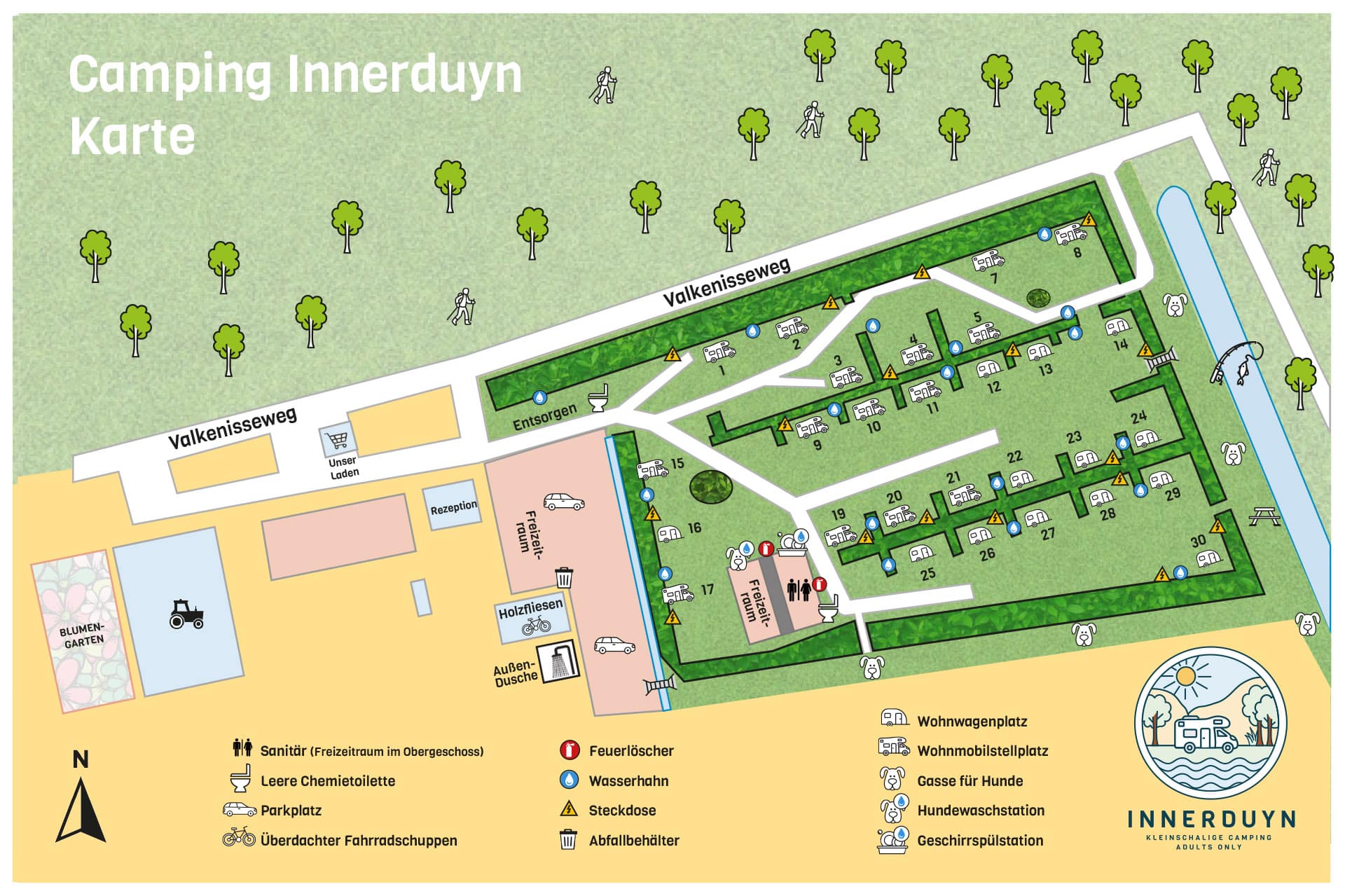 Auf dem Campingplatz Innerduyn legen wir großen Wert auf Ruhe, Platz und Privatsphäre. Das spiegelt sich auch in der Größe der Stellplätze wider, die zwischen 150 und 200m2 variieren. Die Stellplätze sind mit einer gepflegten hohen Hecke abgetrennt, um ausreichend Privatsphäre zu gewährleisten. Sie sind jedoch so angeordnet, dass der Campingplatz trotzdem einen offenen Charakter behält.